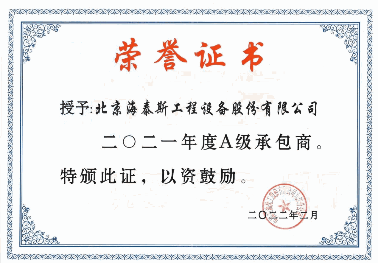 海泰斯獲評(píng)“A級(jí)承包商”榮譽(yù)稱(chēng)號(hào)
